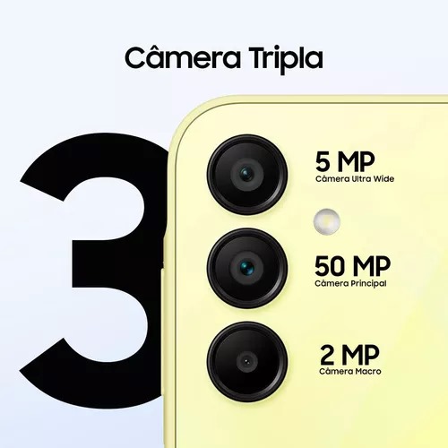 Possui câmera tripla traseira de 50MP +5MP + 2MP, selfie de 13 MP, bateria de 5000mAh com carregamento super rápido, dual chip, dual Messenger e cadeado Galaxy.